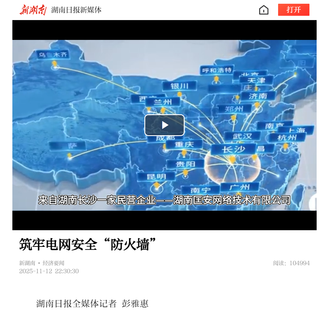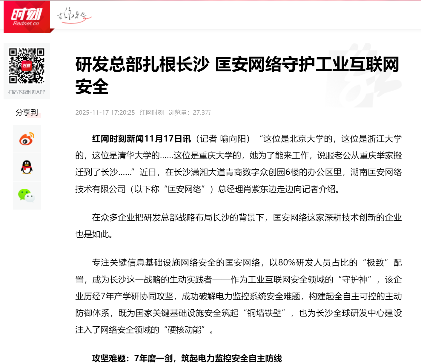 2025 年11月,湖南卫视走进匡安网络开展专题采访与拍摄,向公众科普电力安全重要性,展现行业发展新前景。 作为专注关键信息基础设施网络安全的创新型高科技企业,匡安网络响应二十届四中全会 “加快高水平科技自立自强、发展新质生产力” 的政策指引,以构筑安全稳定的工业网络环境为己任,持续为国家基础设施安全添砖加瓦,争做守护千家万户光明的 “安全卫士”。